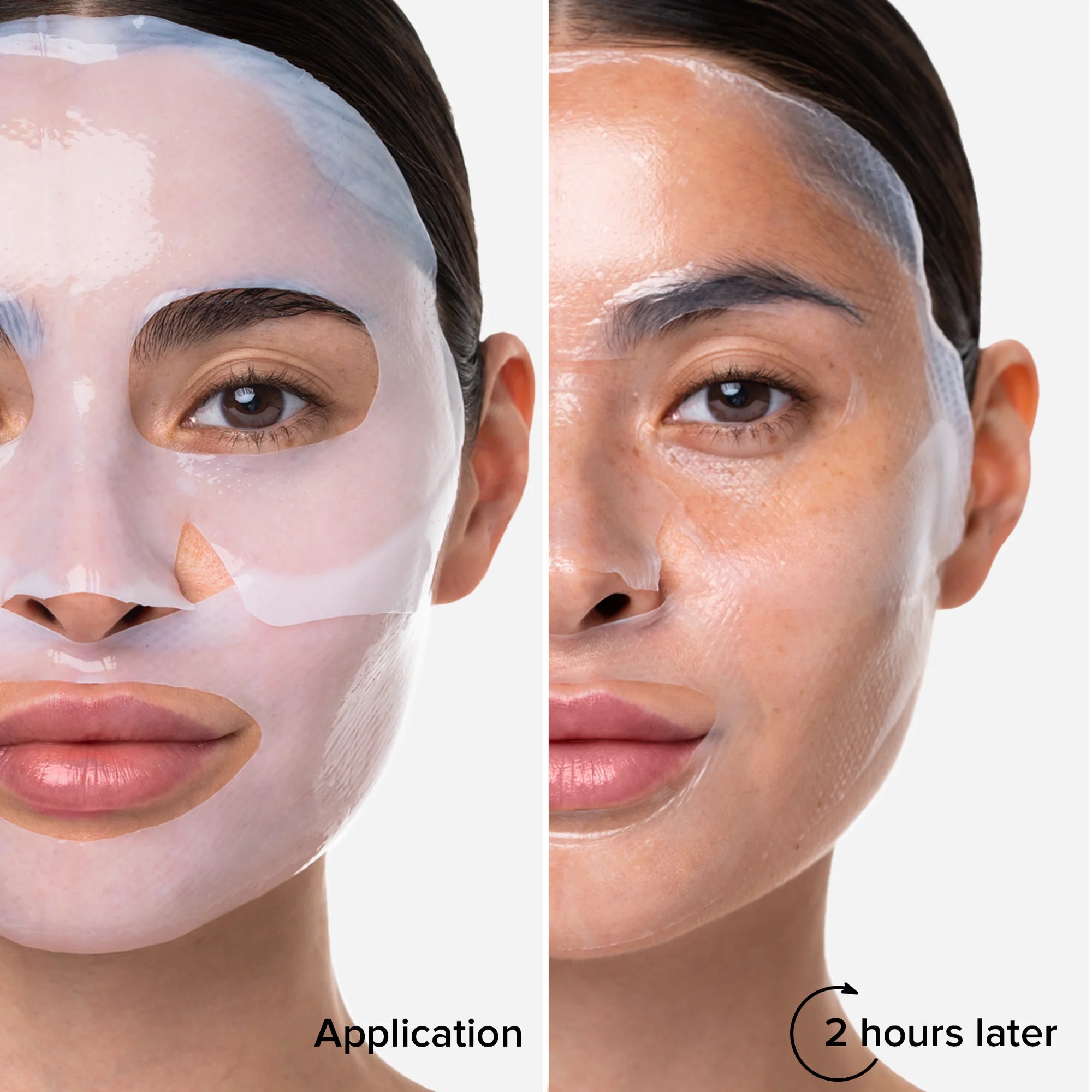 Step 3: Leave the mask on for 1.5 - 2.5 hours or until the mask turns transparent. You don't need to wear it longer - it has given its all to your skin!