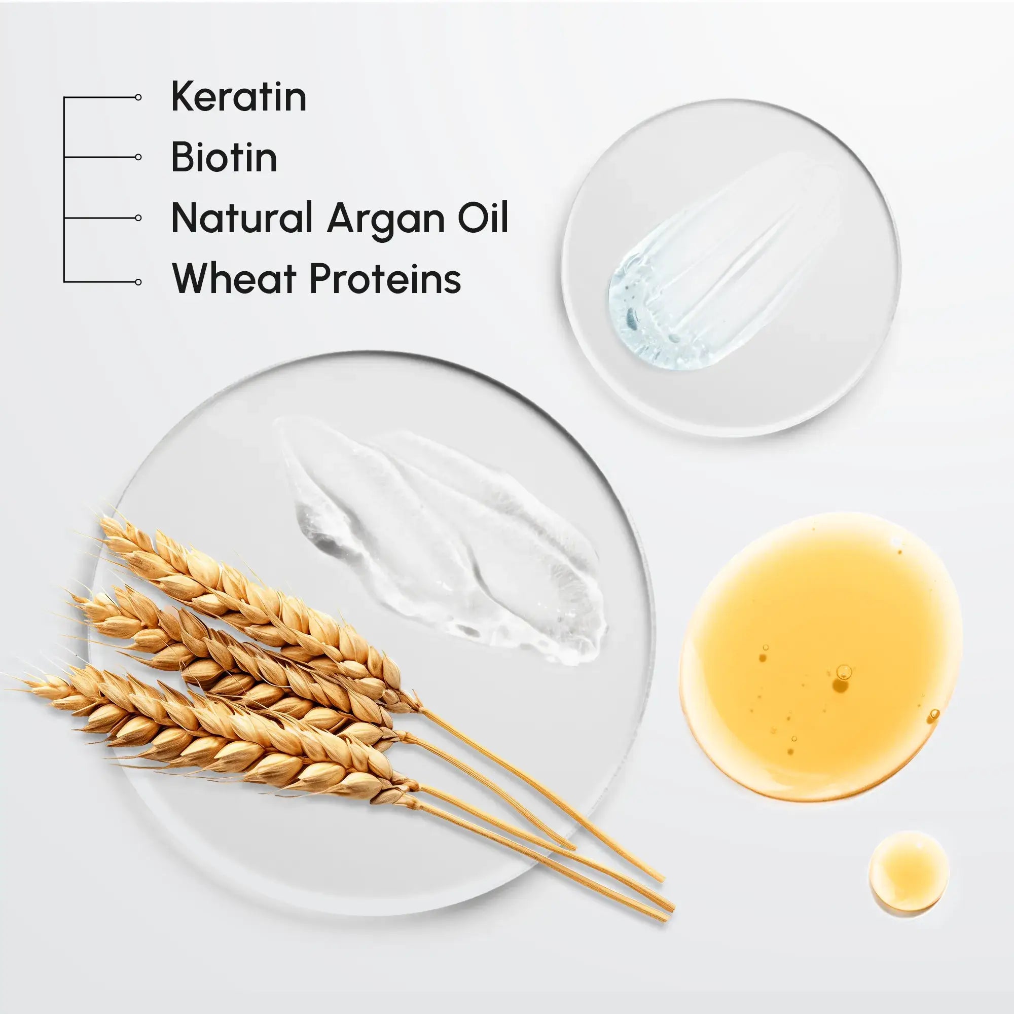Water/Aqua/Eau, Cetearyl Alcohol, Steartrimonium Chloride, Behentrimonium Chloride, Amodimethicone, Dimethicone, Glyceryl Stearate, Argania Spinosa (Argan) Kernel Oil, Hydrolyzed Wheat Protein, Hydrolyzed Keratin, Hydroxyethylcellulose, Dimethiconol, Phenoxyethanol, Allantoin, Panthenol (Pro-Vitamin B5), Biotin (Vitamin B7), Tocopherol (Vitamin E), Guar Hydroxypropyltrimonium Chloride, Citric Acid, Disodium EDTA, Parfum (Fragrance), Red 18 (CI 16255), Blue 1 (CI 42090), Linalool, Limonene.