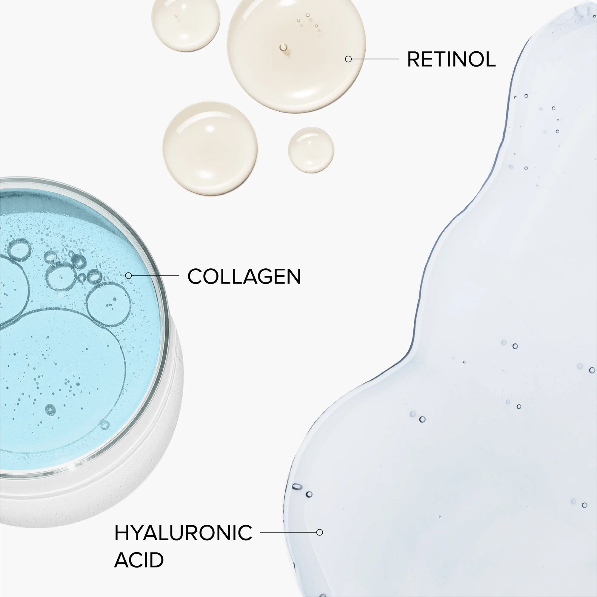Purified Water, Caprylic/Capric Triglyceride, Cocos Nucifera (Coconut) Oil, Simmondsia Chinensis (Jojoba) Seed Oil, Aloe Barbadensis (Aloe Vera) Gel, Stearyl Alcohol, Stearic Acid, Isopropyl Myristate, Retinol (Vitamin A), Hydrolyzed Marine Collagen, Hyaluronic Acid, Acrylates/Steareth-20 Methacrylate Copolymer, Phenoxyethanol, Caprylyl Glycol, Potassium Sorbate, Niacinamide (Vitamin B3), Sodium Phytate, Carbomer, Triethanolamine, Persea Gratissima (Avocado) Oil, Panthenol (Vitamin B5), Organic Matricaria Recutita (Chamomile) Flower Extract, Tocopheryln Acetate.