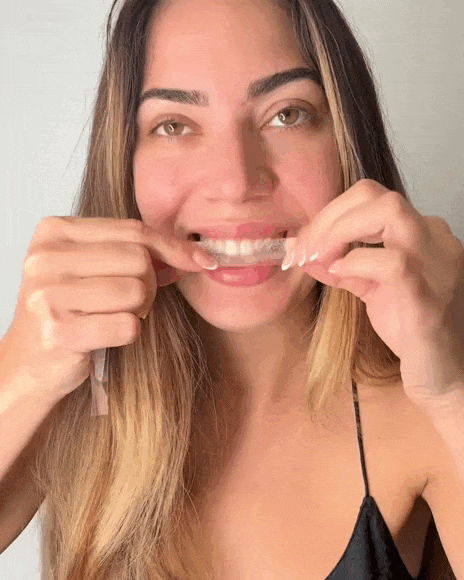 - Carefully place whitening strips with the gel sticking onto the teeth.